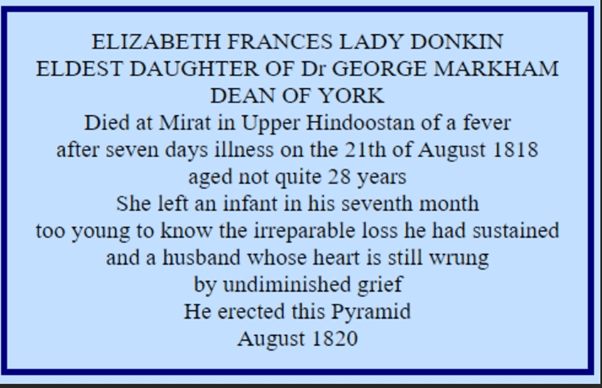 Two months after they were married, Rufane accepted a posting to India and Elizabeth accompanied him. While posted there, Elizabeth gave birth to their son, George in December 1817 but never really fully recovered from the birth. In August 1818, Elizabeth fell gravely ill with ‘fever’ and passed away a week later.