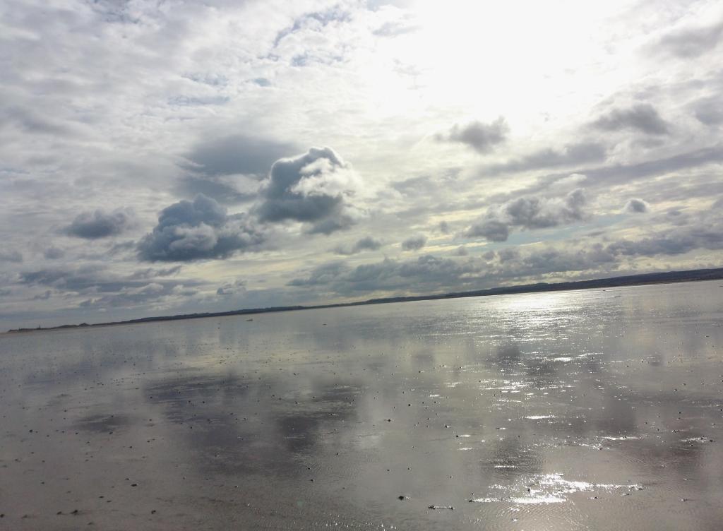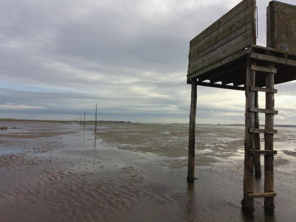 Luckily the tide was going out around 10:00 and coming back in at about 17:00 on the day we visited. So, we removed shoes and socks, rolled up the trouser legs (it was a bit too cold for shorts in October!) and followed the Pilgrim’s Path series of poles through the puddles and mud towards the island.